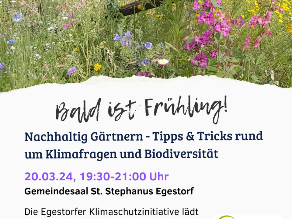 5 Januar, 2026Veröffentlicht von mundi_design Auf 5 Januar, 2026Nachhaltig Gärtnern EgestorfDer Frühling naht und die Egestorfer Klimaschutzinitiative lädt zu Beginn der Gartensaison zum Praxisaustausch ein. Welche Stauden, Sträuche und Bäume sind besonders klimaresilient? Durch welche Maßnahmen […]